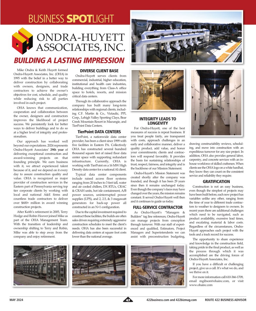 Ondra-Huyett’s expertise in data center construction is featured in Rte. 422 Business Advisor. With low cost per square foot, on-time delivery and highest level of quality, Ondra-Huyett is the area’s premier choice for data center facility construction and renovations.